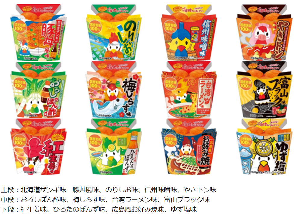 商品は、北海道ザンギ味、豚丼風味、のりしお味、信州味噌味、やきトン味、おろしぽん酢味、梅しらす味、台湾ラーメン味、富山ブラック味、紅生姜味、ひろたのぽんず味、広島風お好み焼味、ゆず塩味。