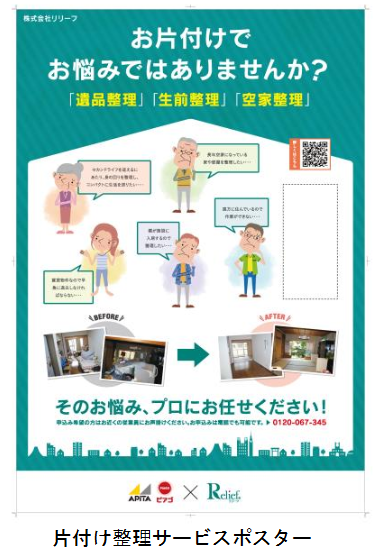 今回は、「終活」に関する「片づけ整理サービス」だ。アピタ長久手、アピタ小牧、アピタ名古屋南、アピタ岡崎北、アピタ鳴海の5店舗の限定展開となる。具体的には遺品整理・生前整理・不用品整理、介護のための住空間づくり、不動産売買に伴う残置物撤去などの取り次ぎ業務を行う。