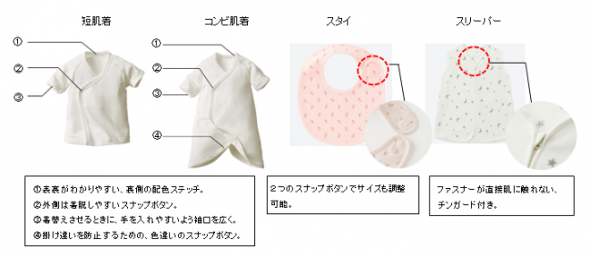 体温調節が苦手な赤ちゃんを念頭に、肌触りが柔かく、汗を吸い取る綿100%の素材を採用した。肌への刺激に配慮し、身頃は背中や脇に縫い目のない1枚仕立てにしている。また、1日に何度も着替える新生児のことを考え、育児をする母親や父親が着せやすいよう、袖口の広さやスナップボタン、ステッチの配色にこだわった。