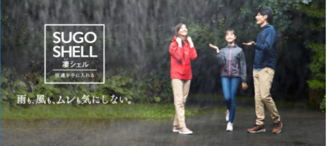 ヘルス&ウェルネス志向でランニングやトレッキングをする人が増え、かつスポーツウェアを取り入れたファッションスタイル「アスレジャー」が人気になるなど、ファッション性の高いスポーツウェアへのニーズが高まっている。今回の「凄シェル」はそうした背景から開発されている。高機能素材によって雨や冷たい風から身を守るほか、衣服内にこもった湿気を外に放出し、快適な衣服内環境を保つことができる。