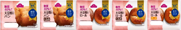 今回の商品には、小麦粉よりも糖質が低い大豆粉と、(株)J-オイルミルズ社が開発したとうもろこし由来のアミロファイバー®(レジスタントスターチ⦅難消化性でん粉⦆を豊富に含むコーンスターチのこと)を独自に配合したオリジナルの粉を使用。これにより一般的なロールパン(*)に比べて糖質を40%減らすことができた。*日本食品標準成分表2015年版(七訂)ロールパンと比較