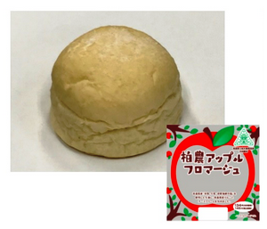 白パン生地には「青森県産まっしぐら」の米紛、「萩原牛乳」、「津軽海峡の塩」を使用。その中にチーズクリームと「青森県産りんご大豆」を入れ、表面に小麦粉をかけ焼き上げた。