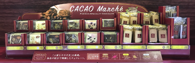 ファミリーマートは、カカオ豆(Bean)から板チョコ(Bar)まで一貫してこだわった「Bean to Bar」や、健康志向の「ハイカカオショコラ」など、ショコラ人気に合わせて、2017年4月からオリジナルチョコレートブランド「カカオマルシェ」を一部地区で先行導入した。