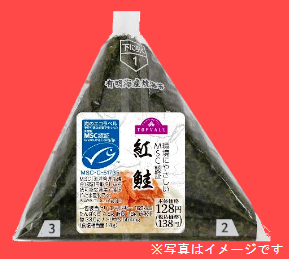 今回のおにぎりに使用しているMSC認証の紅鮭は、最も脂が脂がのるとされる6~7月に、アラスカのブリストル湾で獲れたもの。振り塩後、一昼夜じっくりと熟成させることで紅鮭のうまみを凝縮し、ふっくらと焼き上げた。本体価格128円。