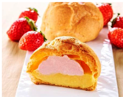 「ダブルクリームの苺ホイップ&カスタードシュー」は140円(税込価格:以下同じ)。苺のホイップとこだわり卵「エグロワイヤル」仕立ての濃厚カスタードを組み合わせたクリームをシュー皮の中に詰めた。