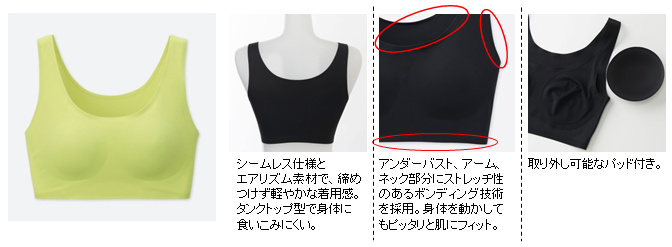 縫い目がほとんど無いシームレス仕様とエアリズム素材により、さらりとした滑らかな肌触り。アンダーバスト、アーム、ネック部分にストレッチ性のあるボンディング技術を採用。身体を動かしても常にピッタリと肌にフィットする。さらに取り出し可能なパッドもついている。タンクトップ型のシルエットで身体に食いこみにくく、「ワイヤレスブラ」シリーズの中でも最も軽やかでストレスフリーな着心地のブラジャーだ。