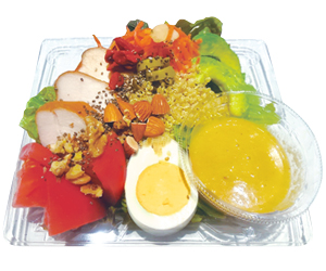 「有機キヌアの13品目シェフズサラダ」は、レタスなど2種類の葉物野菜をベースに、キヌアやチアシードなどのスーパーフードを中心に、11種類の具材を盛り込んだサラダ。素材の色味を活かして、見た目にもカラフルに仕上げている。オリジナルのドレッシングは、甘味と酸味、コクをバランス良く配合してまろやかな味わい。
