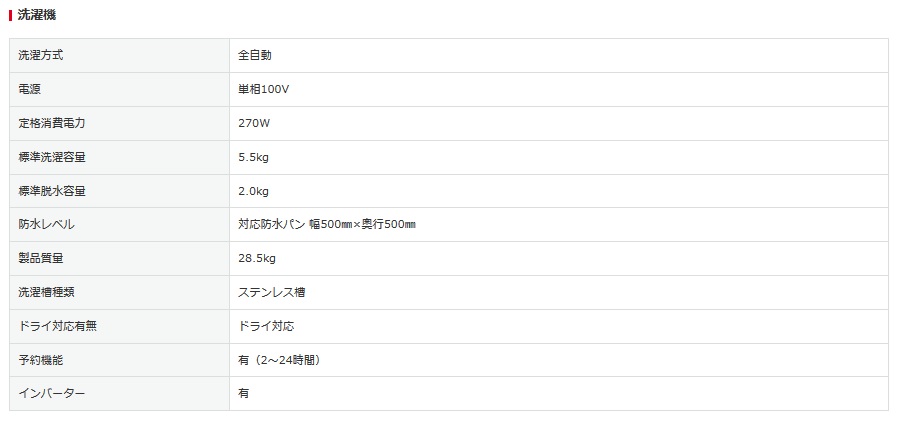 洗濯機は、インバータータイプを採用し、静音、節電タイプの5.5㎏容量タイプ。3人家族までの洗濯が可能だ。