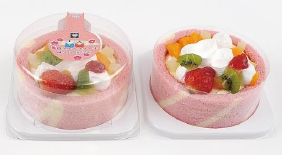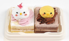 ①は白桃ダイスとホイップクリームをはさんだスポンジケーキとチョコケーキの上に、ベリーチーズクリームとチョコクリームをそれぞれ絞り、にわとりとひよこを表現した。ひなまつりに親子で楽しめるスイーツである。価格は350円(税込)、期間は関東・東海・近畿・四国・九州が2月27日(火)~3月3日(土)、 東北は2月28日(水)~3月3日(土)。