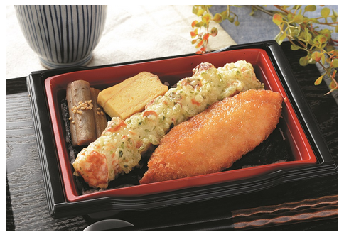 この「のり弁当」では、白身魚フライは、原料の魚の凍結工程を工夫し、ふっくらとした食感に仕上げた。磯部揚げは、竹輪の魚肉の配合率を上げて、歯ごたえと旨みを出した。また、おかずごとの味つけを極力抑え、別添えの醤油をかける食べ方に変更した。