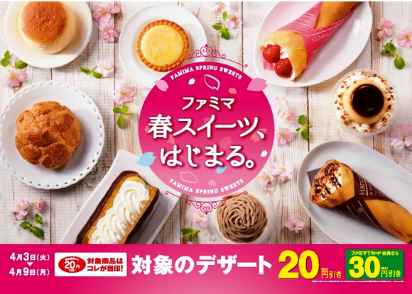 対象商品は、「クリームたっぷり! 濃厚カスタードシュー」をはじめ、「濃厚焼きチーズタルト」(158円)など、手づくりデザート12種類。4月3日(火)から4月9日(月)まで、税込価格から20円引きとする。さらにファミマTカード会員は、30円引きとなる。