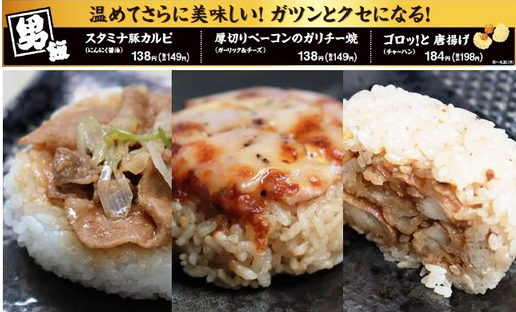 第3に新シリーズのおむすび「男飯」を投入する。商品は、「男飯 ゴロッと!唐揚げ(チャーハン)」(198円)、「男飯 厚切りベーコンのガリチー焼(ガーリック&チーズ)(149円)、「男飯 スタミナ豚カルビ(にんにく醤油)」(149円)の3種類。「ガッツリ!食べたい!」というニーズに合わせ、肉を使用したり、しっかりした味付けに仕上げている。