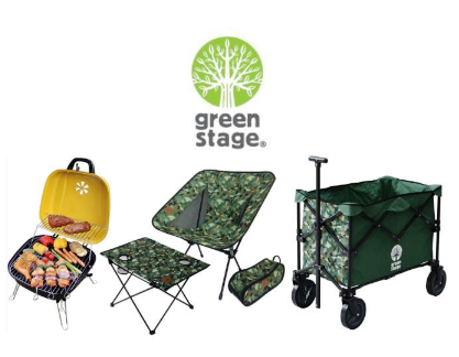 「greenstage®」は2014年に立ち上げた手軽さと機能性を備えたアウトドアブランド。2018年の新アイテムは、「イージーバーベキュー&スモールグリル」(本体価格2980円、以下同じ)、「アクティブチェア迷彩」(3980円)など12アイテム。価格は1980円~7980円。