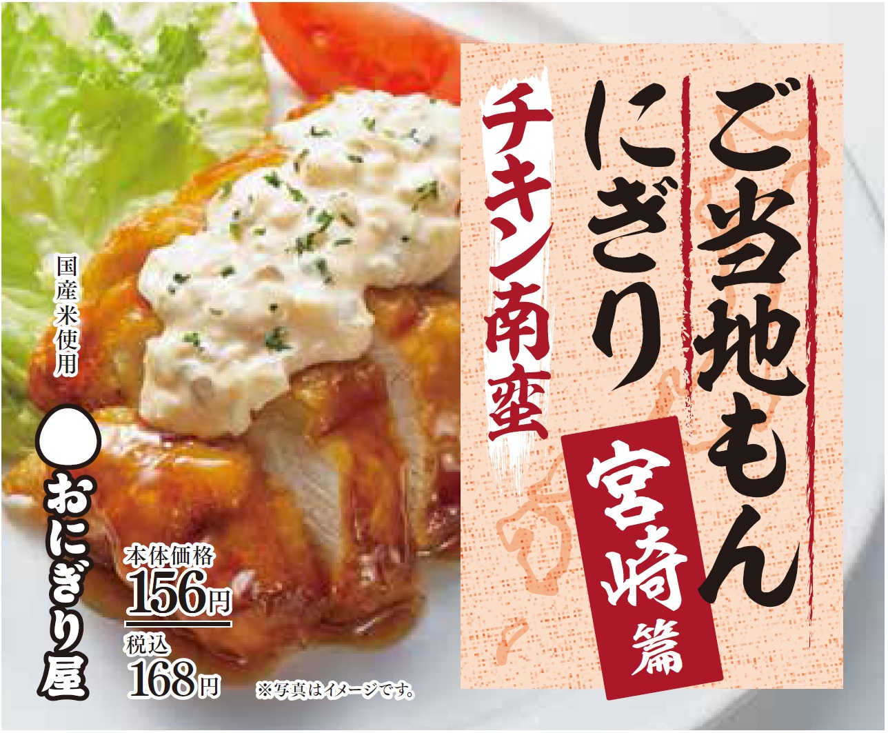 「宮崎篇」は宮崎県名物のチキン南蛮を再現した「チキン南蛮おにぎり」で168円(税込、以下同じ)。卵をつけてから衣をまぶして揚げた鶏むね肉に、甘辛のタレとさっぱりした酸味のタルタルソースで味付けしている。