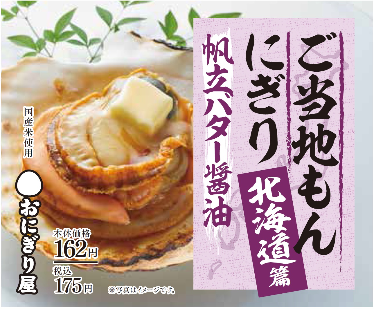 「北海道篇」は、「帆立バター醤油おにぎり」。175円。北海道産バターと醤油で香ばしく焼き上げたベビーホタテ(ホタテ稚貝)を、同じように北海道産バターとだし醤油で味付けしたごはんで包んでいる。