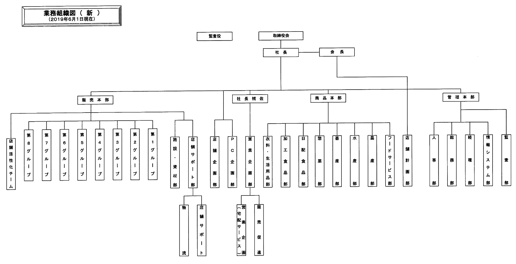 第3に、「店舗企画部」を社長直轄組織として新設する。店舗企画部では、今まで「施設・資材部」の分掌業務だった新店、改装、改造の設計、工事工程管理業務を行う。店舗企画部長は、佐藤一也施設・資材部長が務める。また、井上俊夫施設・資材課長が、施設・資材部長に昇格する。