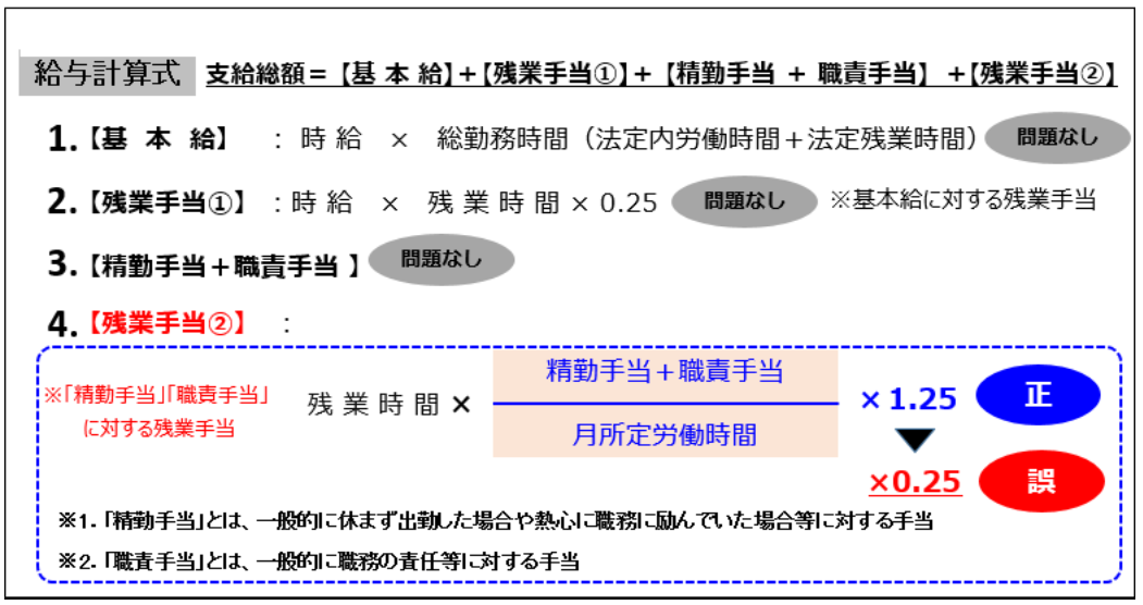 時給勤務者の「精勤手当」「職責手当」に対応する残業手当について、1.25倍の割増率を0.25倍としたことが原因だ。適用法令の理解が十分でなかったことによる。
