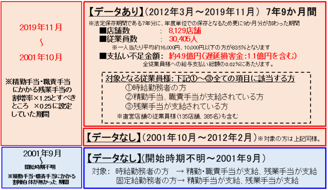 同社が保有している2012年3月から2019年11月までの7年9カ月間に、8129店舗3万405人が対象となり、支払い不足金額は約4億9000万円(遅延損害金1億1000万円を含む)に上る。