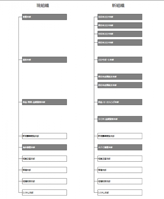 その他、商品・マーケティング本部、SCM・品質管理本部、新規事業開発本部、AFC(エリアフランチャイズ)事業本部、経営企画本部、管理本部、経理財務本部においても組織改編が行われる。