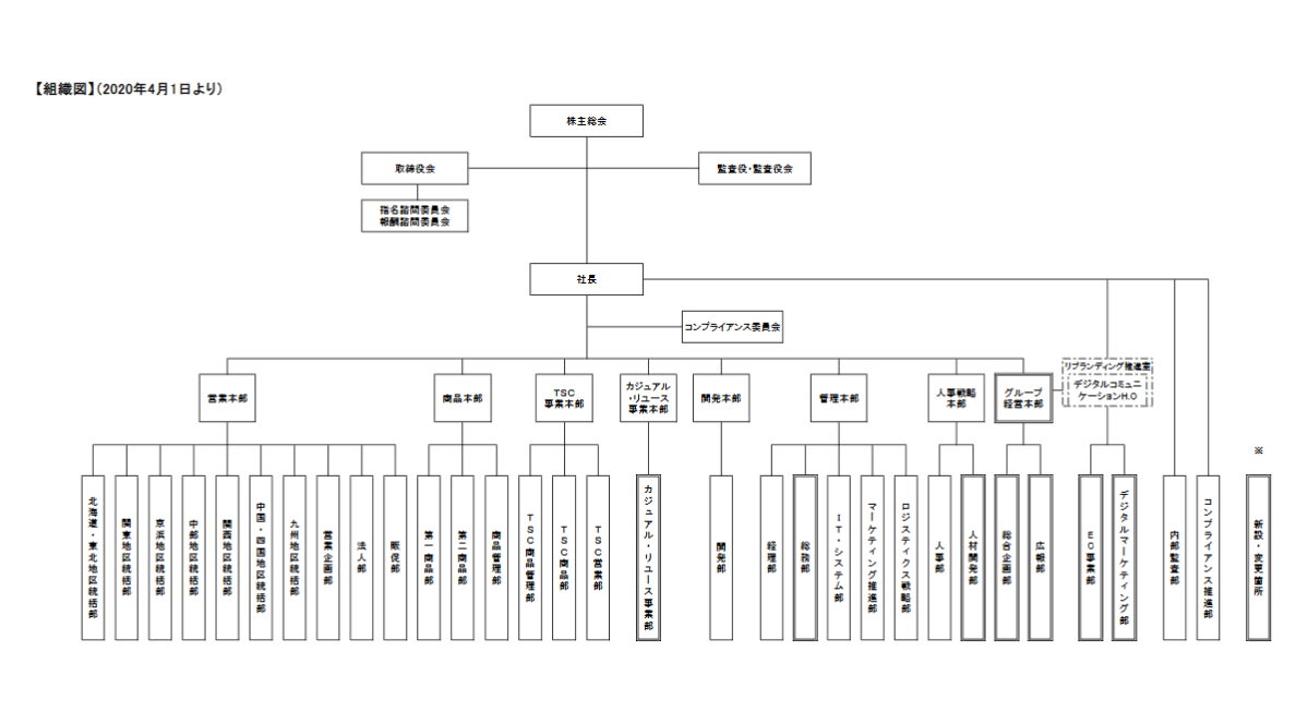 (3)さらなる経営の効率化を推進するために、業務管理部を総務部、人材育成部を人材開発部へ統合する。またカジュアル事業部とリユース事業部をカジュアル・リユース事業部として統合する。