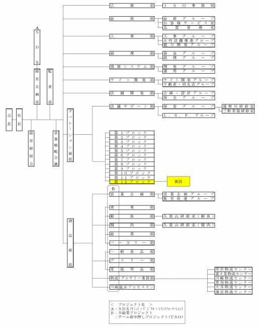 サミットストア店舗のスタンダードレベルの維持、向上を図るため、オペレーション統括部のブロックを、これまでの11ブロックから1つ新設して、12ブロックにする。ブロック内の店舗は再編成する。また、分掌業務の追加および削除を実施する。