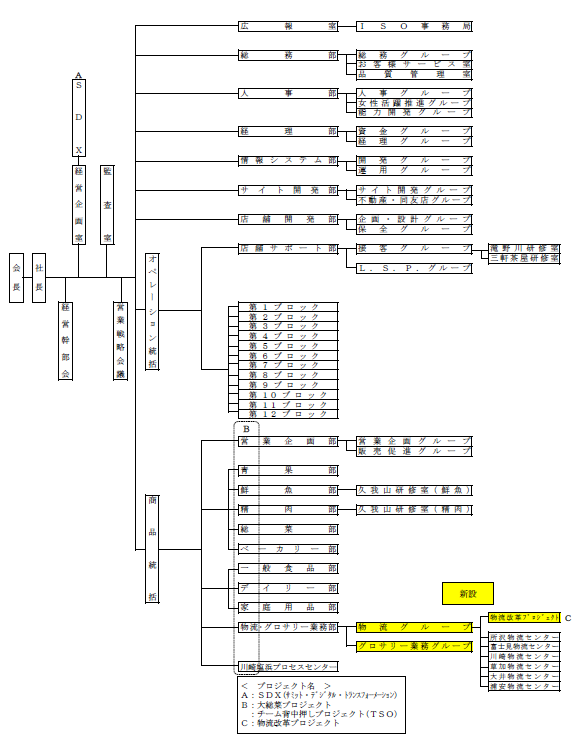 流通スーパーニュース > 組織 > サミットnews|9/30機構改革、物流改革プロジェクト新設 サミットnews|9/30機構改革、物流改革プロジェクト新設 組織 / 2020年09月28日 ツイート サミット(株)(東京都杉並区、服部哲也社長)は9月30日付けで、機構改革を行う。 (1) 従来の物流の考え方の枠組みを超えた、総合的な物流ビジョンの策定し、(2) 業務分担を明確にし、組織の遂行能力を強化することを目的とする。 具体的には、 (1) 物流改革プロジェクトを新設する。 (2) 物流・グロサリー業務部直下に、物流グループおよびグロサリー業務グループを新設する。 ■機構改革後の組織図 ツイート
