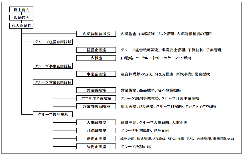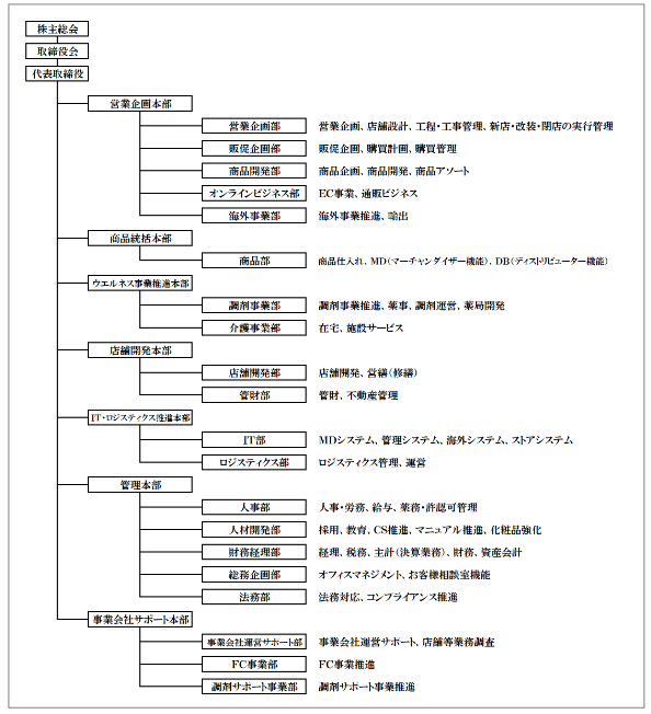 (株)マツキヨココカラ&カンパニー(現マツモトキヨシホールディングス)の組織体制は、統合後のグループ戦略を遂行するにあたり、従来の本部体制から戦略に特化した各統括機能に整理し、より専門的に対応できる機能へ特化する体制とする。