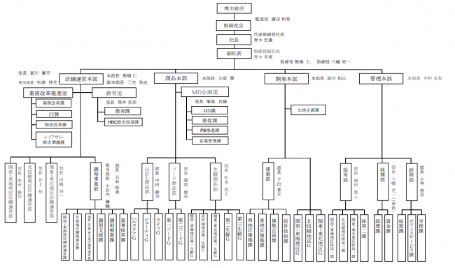 生鮮食品の導入を加速しながら、店舗フォーマットの分析及びMDの再構築を行うため、「商品本部内」にある「レイアウト課」を「MD課」に、「業務改革推進室」内にある「新店準備課」を「レイアウト・新店準備課」に再編・改称する。