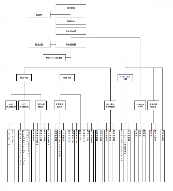 組織変更では、新生ハンズ実現に向けた戦略実行体制をつくるため、業務組織の分割・新設・名称変更・廃止を行う。