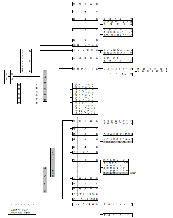 ①「店舗運営本部」および「MD本部」を新設して、「営業本部」の分掌業務を移設する。具体的には、店舗サポート部とブロックは店舗運営本部へ、営業企画部・各商品部・物流部・グロサリー業務部・ネットスーパー推進部はMD本部へ移設する。