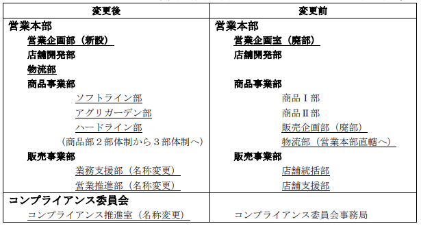 ① 商品事業部内の組織である商品部を商品Ⅰ部、商品Ⅱ部の2部体制からソフトライン部、アグリガーデン部、ハードライン部の3部体制へ変更する。