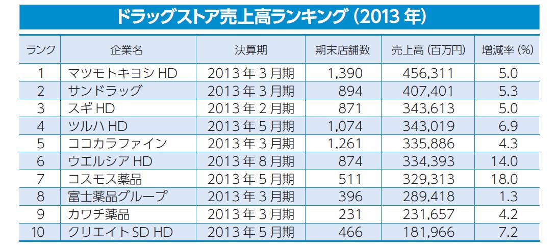2013年度の業界ランキングは、第1位マツモトキヨシHD、第2位サンドラッグ、第3位スギHD、第4位ツルハHD、第5位ココカラファイン。そしてウエルシアHDはその次の第6位だ。