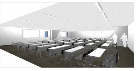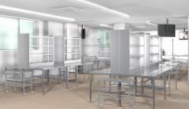 3階に4つの調理実習室(海産・精肉・惣菜・寿司)を設置。各調理実習室にパソコン、大型モニター、ビデオカメラ等を配備し、すべての調理実習室と連動するミーティングルームを設置する。