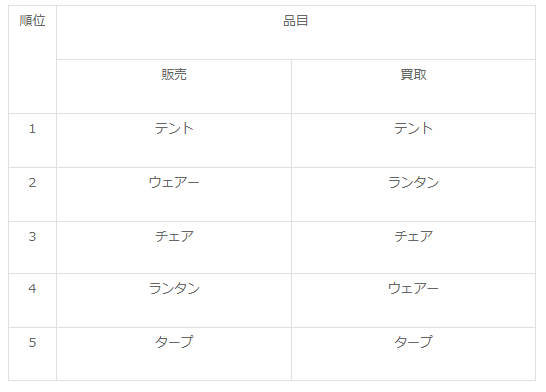 販売・買取数量ランキングを主要品目ごとに集計した結果、買取、販売に入るベスト5は「テント」、「ウエア」、「チェア」、「ランタン」、「タープ」の5品目となった。