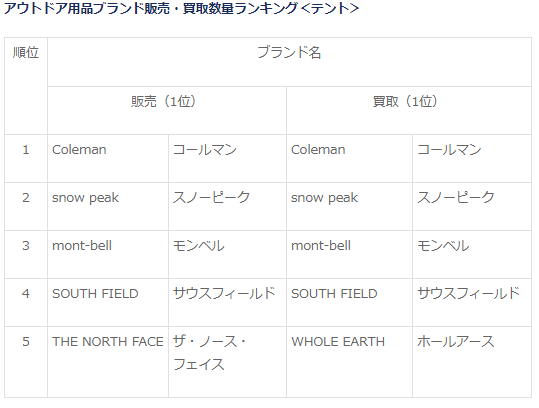 品目ごとのランキングでは「ウエア」を除く4品目すべてで、1位「コールマン」、2位「スノーピーク」となった。