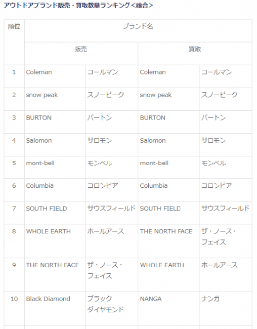ゲオHDnews|2022年アウトドアブランド販売・買取数量順位発表