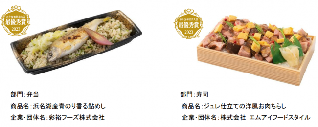 最優秀賞では「弁当部門」は、(株)マミーマートのグループ会社である彩裕フーズ(株)の「浜名湖産青のり香る鮎めし」、「寿司部門」ではクイーンズ伊勢丹を運営する(株)エムアイフードスタイルの「ジュレ仕立ての洋風お肉ちらし」、「サラダ部門」ではサミット(株)の「10回振って食べる!春菊とかぶとみかん・塩糀ドレ」が選ばれた。