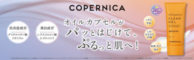 新商品の「薬用クリアゲル」は、炎症を抑えてニキビを防ぐ「抗炎症成分」とメラニンの生成を抑え、しみ・そばかすを防ぐ「美白有効成分」が配合されている美容液。体温で溶けて馴染むオイルカプセルが入ったゲルで、夜の乾燥から肌を守る。また整肌保湿成分が入ったコペルニカの「整肌チューニングコンプレックス」が肌のすこやかな状態をサポートする。