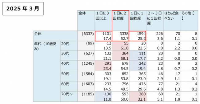 各家庭でのお米を食べる頻度は、「1日に2回程度(52.7%)」と回答した割合が最多。続いて「1日に1回程度(25.2%)」、「1日に3回以上(17.4%)」。全体の95.2%が1日に1回以上お米を食べている結果が出た。2024年10月と比較すると、「1日に2回程度」は1.2%増加、「1日に3回以上」は1.2%減少しており、1日にお米を食べる頻度は前回調査時よりもやや減少した。