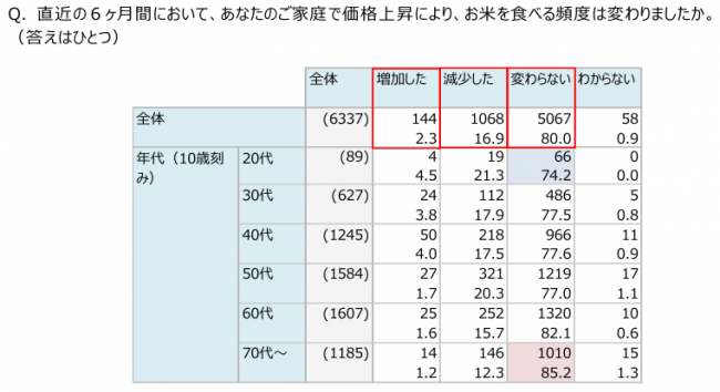 直近の6カ月の米の価格上昇にともない、お米を食べる頻度の変化については、「変わらない(80.0%)」、「減少した(16.9%)」、「増加した(2.3%)」という結果となった。「変わらない」という回答理由については「米が好きだから」「主食だから」「値上しているが他の食品も同様だと思うから」等が挙げられた。