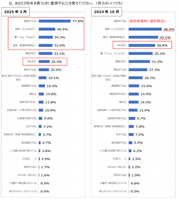 お米を買うときに重視する点では「国産米である(77.8%)」が最多。次点は「銘柄(40.5%)」。続いて「量(34.3%)」、「産地(33.6%)」が上位を占めた。一方で前回2024年10月調査と比較すると、「銘柄」は8.0%、「産地」は9.5%減少した。