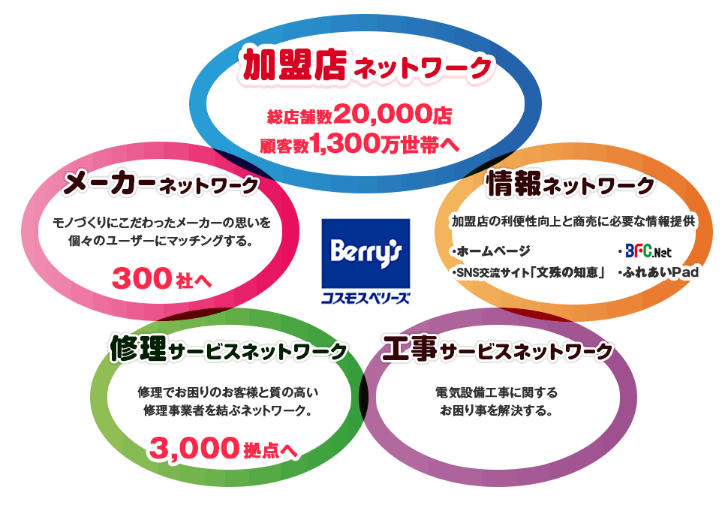 コスモス・ベリーズは、多様な業種の企業をネットワークする新しい形のボランタリーチェーンである。1971年に豊栄家電としてスタートして、家電販売において複数の加盟店で共同仕入れをしていた。しかし、家電量販店が隆盛を極めて、地域の小規模店舗の共同仕入れでは立ち向かうことができなくなった。