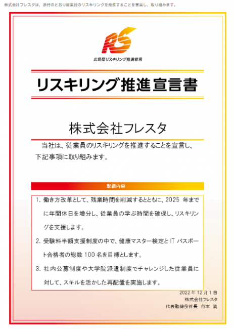 今年から広島県が施行したリスキリング推進宣言制度に則ったもの。フレスタおよびフレスタホールディングスの宣言書には働き方改革による残業時間の削減と年間休日の増分を進めることや資格検定の受験料半額補助制度や社内公募制度、大学院派遣制度を明示して、従業員のリスキリングを支援する。