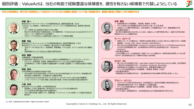 同社では「取締役会意見に関するプレゼン資料」において、「バリューアクト・キャピタルの提案候補者のうち3名は食品・小売業界での経験がなく、残り1名も日々変化するこの業界における経験を過去5年間有さない」ことを反対する理由として挙げている。