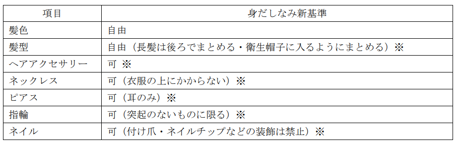 安全面や衛生面に配慮したうえで、髪色や髪型の自由、ヘアアクセサリー、ネックレス、ピアス、指輪、ネイルの使用を認める。