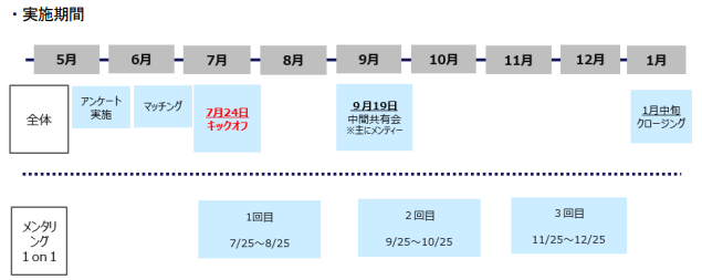 実施後アンケートにおいて、メンティーは一つ上の職位を担うことへの自信の高まりがみられたこと、メンターも企業の枠を超えた人材育成が自身の成長機会にもつながったことなど、プログラムの効果が確認されたことから、イオン、シチズン時計が加わり5社による展開となった。7月24日のキックオフより、3回のメンタリング、中間共有会を経て、1月のクロージングまで、約7カ月間のプログラムを実施する。