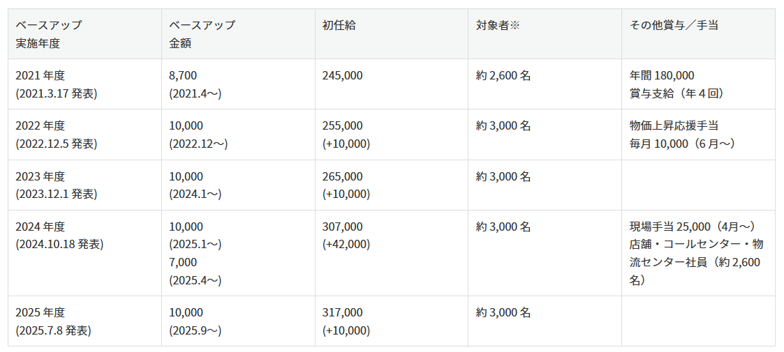 1回目のベースアップによって大学卒の初任給は現行より1万円上乗せの31万7000円になる。さらに2回目の金額が加算されることで、業界最高水準になる。