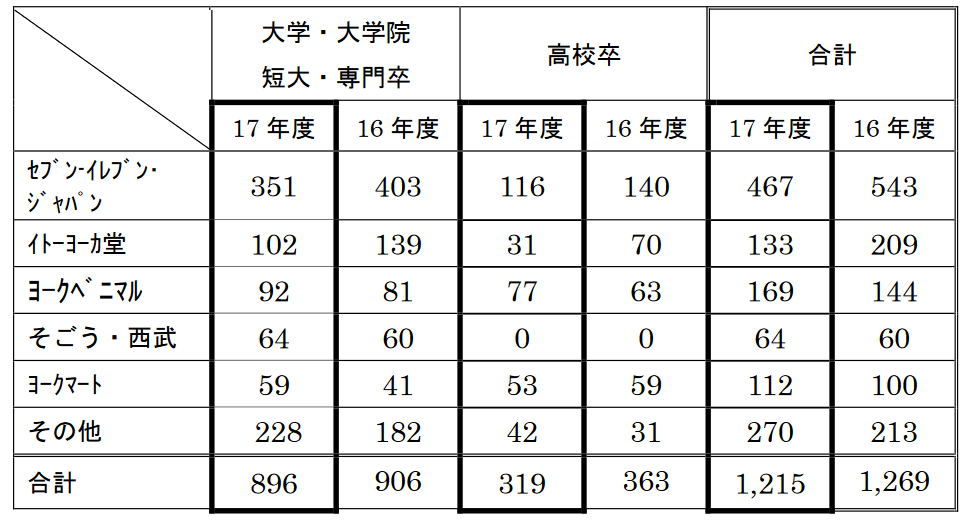 採用人数が一番多いのがセブン-イレブン・ジャパンで467人、その次がヨークベニマルの169人、三番目がイトーヨーカ堂の133人。ヨークマートが112人、そごう・西武が64人。ベニマルの方がイトーヨーカ堂よりも採用人数が多いというのも感慨深い。そごう・西武はヨークマートより少ない。百貨店業態の衰退はここにも表れている。しかし、この採用人数を見ていても、セブン&アイはセブン-イレブンの会社だということがよくわかる。