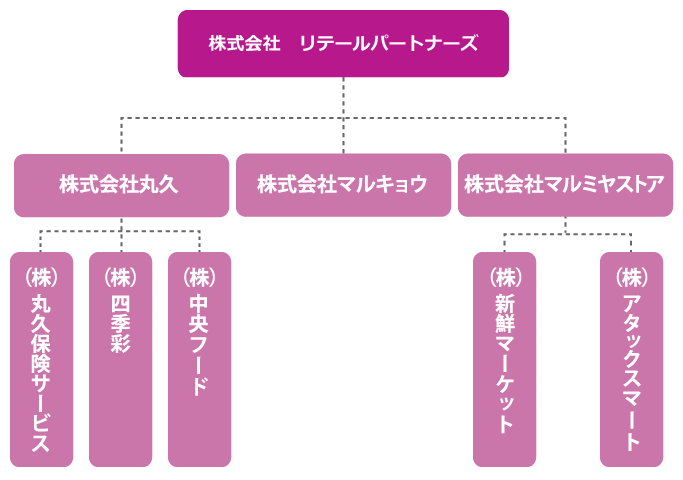 上記3氏は、グループ会社の取締役を兼務している。田中康男氏は丸久代表取締役社長、池邉恭行氏はマルミヤストア代表取締役社長、斉田敏夫氏はマルキュウ代表取締役会長兼CEO。