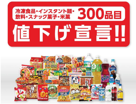 (株)フジ(愛媛県松山市、尾﨑英雄社長)は、5月1日(火)から、⑴冷凍食品、⑵飲料、⑶インスタント麺、⑷スナック菓子、⑸米菓のカテゴリーの300品目の値下げを実施している。